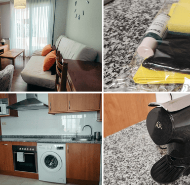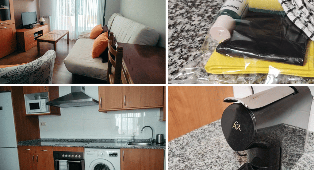Todo el espacio es abierto, porque nos gusta que la casa respire. Cocina completa con frigorífico grande, placa para cocinar, utensilios y dos tipos de cafetera: italiana y de cápsulas compatibles con Nespresso, para que no haya discusiones matutinas. Dejamos lo básico para empezar: estropajo, jabón, trapo y bolsa de basura. En el comedor hay mesa plegable, un sillón, un sofá cama y una tele pequeña que no es smart TV, pero tiene HDMI por si vienes con portátil. Y sí, hay juegos de mesa por si el tiempo decide ponerse pirenaico.